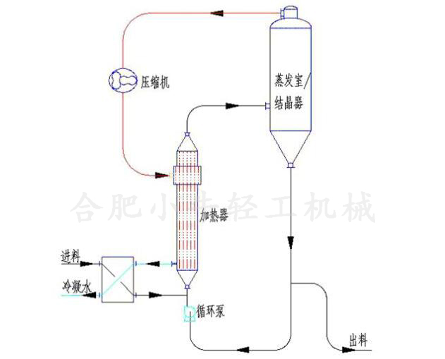 物料在加熱器的管程內(nèi)被殼程的蒸汽加熱溫度升高,在循環(huán)泵作用下物料上升到分離器中,在分離器內(nèi)由于物料靜壓下降使物料發(fā)生蒸發(fā)。蒸發(fā)產(chǎn)生二次蒸汽從物料中溢出,物料被濃縮產(chǎn)生過飽和而使結(jié)晶生長,解除過飽和的物料進(jìn)入強(qiáng)制循環(huán)泵,在循環(huán)泵作用下進(jìn)入加熱器,物料如此循環(huán)不斷蒸發(fā)濃縮或濃縮結(jié)晶。晶漿從循環(huán)管路中用出料泵輸出。蒸發(fā)分離器內(nèi)的二次蒸汽經(jīng)過蒸發(fā)分離器上部的分離和除沫裝置凈化后輸送到壓縮機(jī),壓縮機(jī)把二次蒸汽壓縮后輸送到加熱器殼程用作蒸發(fā)器加熱蒸汽,實現(xiàn)熱能循環(huán)連續(xù)蒸發(fā)。